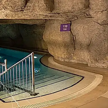 Enjoy a serene escape in our luxurious pool area, featuring natural rock formations and cascading water for ultimate relaxation and rejuvenation in Istanbul.